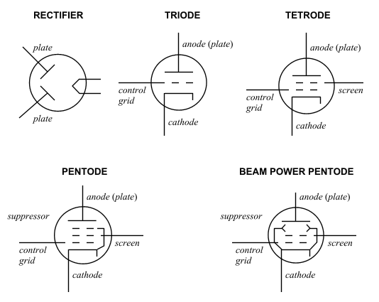 There are five standard tube types that are utilized in audio electronic equipment. Fig. 2 illustrates the schematic diagrams for each type.