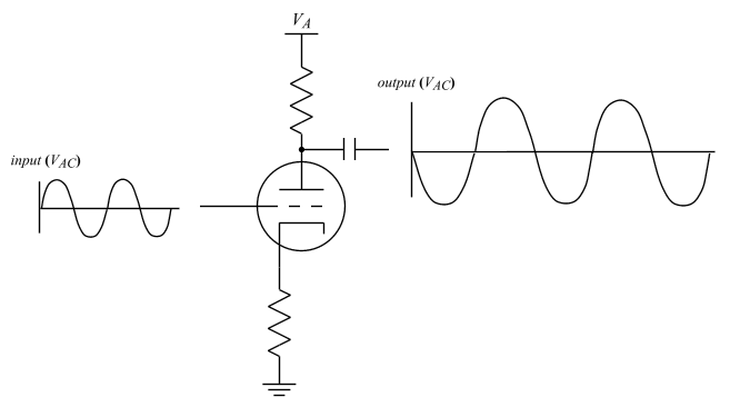 The preamp generally makes use of 12AX7 triode tubes. The most common configuration is the common cathode. The common cathode gives rise to a signal with a 180 degree phase shift. This means that the output goes low as the input goes high and vice versa. It is instructive to recall the operation of the control grid and verify that this is truly the case.