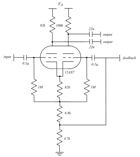The phase splitter allows us to draw an equal and opposite signal to the power amp stage. Although many phase splitter topologies exist, the one illustrated in Fig. 10 is the most common among commercial guitar amplifiers.