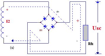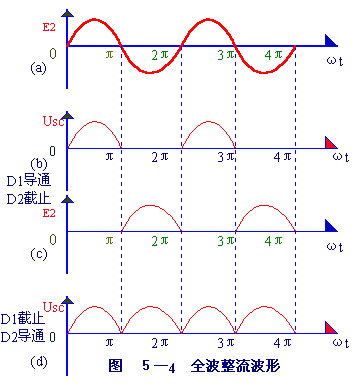 如此反復(fù),由于兩個整流元件D1 、D2 輪流導(dǎo)電,結(jié)果負(fù)載電阻Rfz 上在正、負(fù)兩個半周作用期間,都有同一方向的電流通過,如圖5-4(b)所示的那樣,因此稱為全波整流,全波整流不僅利用了正半周,而且還巧妙地利用了負(fù)半周,從而大大地提高了整流效率(Usc =0.9e2,比半波整流時大一倍)。
