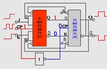 ??? S當(dāng)CP=1時,輸入J、K影響主觸發(fā)器,而從觸發(fā)器狀態(tài)不變。當(dāng)CP從1變成0時,主觸發(fā)器的狀態(tài)傳送到從觸發(fā)器,即主從觸發(fā)器是在CP下降沿到來時才使觸發(fā)器翻轉(zhuǎn)的。