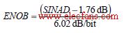 如果失真積和帶外頻譜成分混疊無法保持在本底噪聲以下,則會形成SINAD(信號-噪聲和失真比)。轉換器在輸入信號額定條件下將以dB 表示SINAD。轉換器ENOB(有效位數(shù))可能是ADC 最常提到的交流規(guī)格,它便是以位而非dB表示的SINAD: