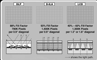 D-ILA(Direct-Drive Image Light Amplifier,直接驅(qū)動(dòng)圖像光源放大器)技術(shù)。D-ILA技術(shù)在提供高分辨率和高對(duì)比度方面顯示了技術(shù)優(yōu)勢(shì),2000年,D-ILA技術(shù)的投影機(jī)的標(biāo)稱分辨率達(dá)到S-XGA(1365×1024),對(duì)比度達(dá)到了350:1,D-ILA技術(shù)的核心部件3.3cm(1.3英寸)液晶板的標(biāo)稱分辨率達(dá)到了QXGA(2048×1535)。