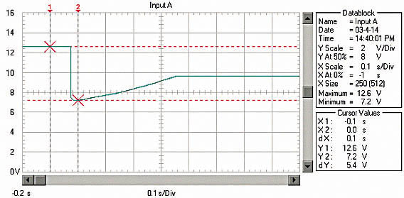 由于RM、RB、RL均非常低,啟動(dòng)電流非 常大。例如用12V、45Ah的蓄電池啟動(dòng)安裝1.9升柴油機(jī)的汽車,蓄電池的電壓在啟動(dòng)瞬間由12.6V降到約3.6V!啟動(dòng)過程的蓄電池電壓波形如圖 1;啟動(dòng)瞬時(shí)的電流達(dá)550A,約為蓄電池的12C的放電率!啟動(dòng)過程的蓄電池電流波形如圖2,(電流傳感器的電流/電壓變換比率:100A/V)。盡管 車用蓄電池是啟動(dòng)專用蓄電池,可以高倍率放電,但在圖1中可以看出,10倍以上的高倍率放電時(shí)的蓄電池性能變得很差,而且,如此高倍率放電對(duì)蓄電池的損傷 也是非常明顯的。啟動(dòng)過程的電壓劇烈變化也是極強(qiáng)的電磁干擾,可以造成電氣設(shè)備的“掉電”,迫使電氣設(shè)備在發(fā)電機(jī)啟動(dòng)過程結(jié)束后 重新上電,計(jì)算機(jī)在這個(gè)過程中非常容易死機(jī)。因此,無論從改善汽車電氣設(shè)備的電磁環(huán)境還是改善汽車的啟動(dòng)性能和蓄電池的性能、延長使用壽命來考慮,改善汽 車電源在啟動(dòng)過程的性能是必要的。