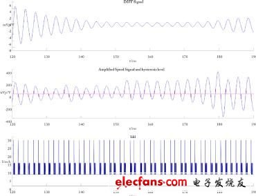 通過此項建模,可以分析與輸入信號呈函數(shù)關系的系統(tǒng)行為。圖 9 中的第一張圖表顯示通過改變傳感器和編碼器輪之間的距離而產(chǎn)生的磁輸入信號。此信號是有限元件仿真結果,之后 AMR 效應可將此信號轉(zhuǎn)化成傳感器橋的電輸出信號。中間的圖表是模擬信號處理的結果。下面一張圖表顯示輸出信號。此器件使用 A 7/14/28 mA 協(xié)議。這種協(xié)議可用來傳送額外信息,例如感測旋轉(zhuǎn)或氣隙長度。除了這些結果之外,也可以檢查數(shù)字控制的運行情況。圖 10 顯示的是 ModelSim 中的信號圖象實例。