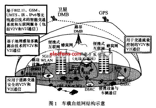 可以看到,衛(wèi)星通信系統(tǒng)分別為車載自組網(wǎng)提供全球定位服務(wù)(GPS,global positioning system)和數(shù)字多媒體服務(wù)(DMB,digital multimedia broad—casting)。車與車通信使車輛之間能夠通過多跳的方式進(jìn)行自動(dòng)互聯(lián),這好比車與車之間能夠像人一樣互相交談,起到提高車輛運(yùn)行的安全和疏導(dǎo)交通流量等作用。車載自組網(wǎng)除了可以單獨(dú)組網(wǎng)實(shí)現(xiàn)局部的通信外,還可以通過路燈、加油站等作為接入點(diǎn)的網(wǎng)關(guān)(gateway),連接到其他的固定或移動(dòng)通信網(wǎng)絡(luò)上,提供更為豐富的娛樂、車內(nèi)辦公等服務(wù)。在本文中,針對(duì)車載自組網(wǎng)的特點(diǎn)和技術(shù)難點(diǎn),主要討論車與車之間通信的自組網(wǎng)方式。