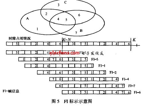 ?、?通過(guò)每幀周期廣播幀信息(FI,frame information),使所有的鄰節(jié)點(diǎn)都知道每一個(gè)時(shí)隙的信道使用狀況,從而使RR—AL OHA協(xié)議能夠在車載自組網(wǎng)中正確運(yùn)行。FI是發(fā)送節(jié)點(diǎn)感知的前一幀的時(shí)隙狀態(tài)信息。RR—AL OHA 可以在不同的物理層標(biāo)準(zhǔn)下使用,尤其適合采用時(shí)隙結(jié)構(gòu)的物理層。當(dāng)有節(jié)點(diǎn)加入時(shí),先偵聽(tīng)一幀的時(shí)間,然后選擇一個(gè)空閑時(shí)隙發(fā)送一個(gè)分組,來(lái)預(yù)約這個(gè)時(shí)隙。如果鄰節(jié)點(diǎn)正確接收到了該分組,則在它的FI中標(biāo)示出來(lái)。當(dāng)新加入的節(jié)點(diǎn)從一幀時(shí)間內(nèi)收到的所有FI中知道鄰節(jié)點(diǎn)都正確接受到分組時(shí),即認(rèn)為預(yù)約成功,從而將每幀的該時(shí)隙作為它的基本信道(BC,base channe1),直到節(jié)點(diǎn)離開(kāi)網(wǎng)絡(luò),在這期間其他節(jié)點(diǎn)不能訪問(wèn)該時(shí)隙。其中,BC 信道用于傳送FI、其他信令信息和承載有效載荷。在每一幀中,節(jié)點(diǎn)都必須在自己的BC中發(fā)送FI信息,并根據(jù)鄰節(jié)點(diǎn)的FI和自己的信道使用情況及時(shí)更新FI信息。當(dāng)BC信道提供的帶寬不能滿足業(yè)務(wù)的要求時(shí),節(jié)點(diǎn)可以通過(guò)預(yù)約附加信道的方式占用其他空閑信道,以滿足業(yè)務(wù)要求。如果是點(diǎn)對(duì)點(diǎn)通信,節(jié)點(diǎn)還可以預(yù)約點(diǎn)對(duì)點(diǎn)(P2P,point—to—point)信道進(jìn)行傳送,以實(shí)現(xiàn)相鄰一跳群中的時(shí)隙復(fù)用,提高信道的利用率。圖5顯示了節(jié)點(diǎn)交換FI信息的示例。