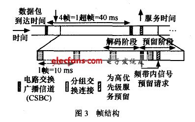 為了避免在隨機(jī)信道接入機(jī)制下的保留請(qǐng)求沖突,一種電路交換廣播連接(CSBC,circuit.switched broadcast channe1)被引入,它主要用來(lái)作為信令目的。如果在幀中沒(méi)有足夠的容量來(lái)支撐數(shù)據(jù)的發(fā)送,節(jié)點(diǎn)就可以利用CSBC來(lái)發(fā)送額外容量保留請(qǐng)求,如圖3所示。