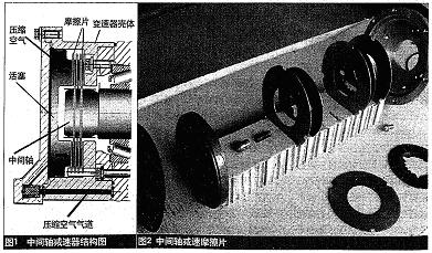 從低檔換入高檔時,需降低被換檔齒輪的速度,同時中間軸亦要降低速度。中間軸降低速度后,將使被換檔齒輪上結(jié)合齒圈與結(jié)合齒套內(nèi)外花鍵齒同步,達(dá)到換檔目的降低中間軸速度是通過安裝在中間軸前端的中間軸減速器的制動(見圖1)作用完成的。中間軸減速摩擦片(見圖2)有2片,一片固定在中間軸一端另一片固定在滑動活塞上,活塞與變速器殼體相對固定不能轉(zhuǎn)動,只可軸向移動。軸向移動時可使2片摩擦片接觸,產(chǎn)生制動力降一低中間軸速度。中間軸制動只有在低檔換入高檔時起作用。