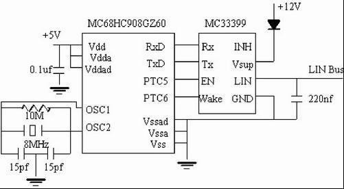 此外,選擇飛思卡爾MC33399芯片與核心MCU通過SCI口相連,作為LIN總線收發(fā)器。該芯片最多可以驅(qū)動16個(gè)節(jié)點(diǎn)。