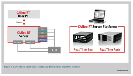 ????? 為了對ECU的功能進行測試,有時需要對其工作環(huán)境進行仿真。被測設(shè)備或系統(tǒng)通常嵌入到硬件在環(huán)仿真中。一個最小化的殘余總線仿真應(yīng)該對被測ECU產(chǎn)生輸入幀,并對ECU的輸出幀做出反應(yīng)。當然,如果能夠仿真測試環(huán)境(如傳感器輸入和執(zhí)行器輸出)更好。在一些更復雜的案例中,近似連續(xù)控制算法(例如用Matlab/Simulinnk定義的控制算法)可以在CANoe下運行。由于時間觸發(fā)通信需要根據(jù)一個全局FlexRay時間進行,因此被仿真的控制器和ECU的控制算法必須與FlexRay調(diào)度表實現(xiàn)同步。所以運行平臺必須提供同步點,在保證小延遲的同時,保證最小的、定常的抖動。這樣可以確保在總線上提供時間正確的數(shù)據(jù)更新。對于環(huán)境仿真和殘余總線仿真,運行平臺必須是確定性的。CANoe實時系統(tǒng)(包括硬件平臺)提供了一個高性能的確定性平臺。CANoe和CANoe實時系統(tǒng)(包括硬件平臺)可以無縫集成在一起,從而滿足性能、總線和IO接口三方面要求。在CANoe和CANoe實時系統(tǒng)中可以使用相同的模型。