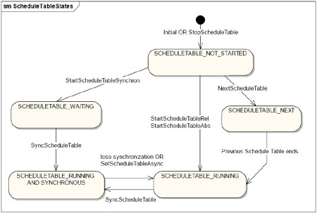 ??? 圖2:調(diào)度表狀態(tài)圖顯示了同步是如何實現(xiàn)的。調(diào)度被啟動,但不必立即完全同步(RUNNING)。為實現(xiàn)同步運行(AND SYNCHRONOUS),可以進入等待狀態(tài)(SHEDULETABLE_WAITING)或者進行軟同步。