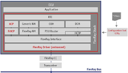 ???? 圖4:符合AUTOSAR標準的FlexRay軟件方案可靈活地適應(yīng)不同的需求。該圖展示了一種帶有driver(相對于AUTOSAR進行了擴展并增加了XCP傳輸層和協(xié)議模塊)的FlexRay棧。