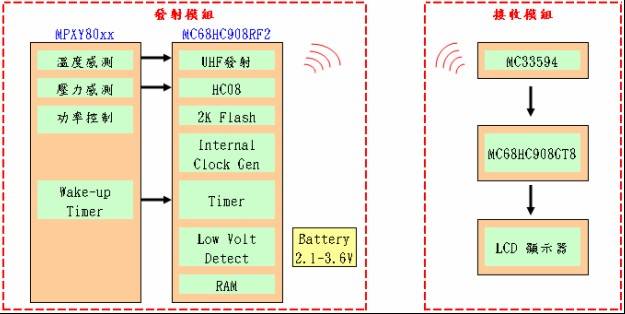 ??? 發(fā)射模塊由胎壓傳感器MPXY80xx及內(nèi)含射頻發(fā)射的微控制器MC68HC908RF2組成,MPXY80xx工作在2.1-3.6V,具有低功耗的效能以延長電池壽命。并整合MCUwake-uptimer與自身的低頻震蕩器。此外,其輸出為8bit數(shù)字輸出,并已經(jīng)與MC68HC908RF2完成接口最佳化。接收模塊主要由射頻接收芯片MC33594及微控制器MC68HC908GT8及相關(guān)的外圍線路組成。接收靈敏度為90dBm,因為訊號發(fā)射時間很短,加上每個發(fā)射單元都有其獨特ID,就由此可減少汽車EMI的干擾影響。