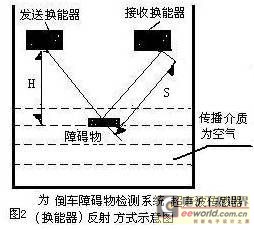 倒車(chē)撿測(cè)障礙糸統(tǒng)超聲換能器的工作方式為反射式,,即發(fā)送傳感器換能器發(fā)射40KHz頻率的超聲波,迂到障礙后反射被接收傳感器的換能器接收并轉(zhuǎn)換成電信號(hào),見(jiàn)圖2所示.