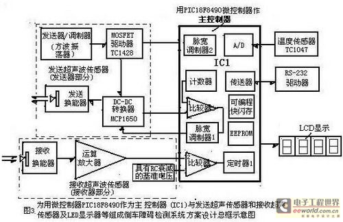 設(shè)計(jì)方案包括:IC1主控器-為用Microchip的 PIC l8F8490微控制器作為汽車倒車障礙檢測(cè)系統(tǒng)的主控器;發(fā)送部份(即發(fā)送超聲波傳感器)與接收部份(即接收超聲波傳感器);溫度傳感器(TC1047A)、通信接口RS-232驅(qū)動(dòng)器以及與LCD或LED顯示器等外圍電路組成。