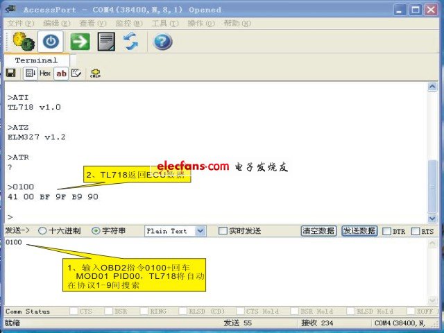 TL718 Starting注:ATZ指令返回 ELM327 V1.2是為了使用現(xiàn)成的國外OBD觀軟件,所以用了這個返回信息。