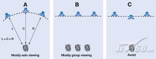 ??? 前置揚(yáng)聲器應(yīng)該擺放在觀賞者前方視野范圍內(nèi),如圖1所示。如果大部分的時(shí)候是一個(gè)人欣賞,那么請(qǐng)按下面圖(A)所示擺放揚(yáng)聲器,這里左、中、右揚(yáng)聲器離您坐的位置距離相同。如果你的系統(tǒng)設(shè)計(jì)為多人欣賞用,那么請(qǐng)按圖(B)所示,將揚(yáng)聲器擺放成一直線。無論是什么情況,請(qǐng)避免將中置揚(yáng)聲器擺放在比前左、前右更接近觀賞者的位置,請(qǐng)看圖(C)。