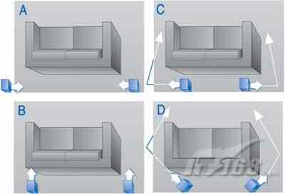 ??? 當(dāng)然,不是所有的家庭影院環(huán)境中都有側(cè)墻可以安裝環(huán)繞揚(yáng)聲器。如果您遇到這種情況,可以考慮以下的安裝方式:一般來講,不建議將環(huán)繞揚(yáng)聲器直接安裝于聽音者后面。但如果沒有選擇,您可以嘗試以下如圖8所示的方法。將它們安裝在高于人耳的位置,并盡量使它們互對(duì)(A),朝向前方(B),或者朝向側(cè)墻(C 和D)。嘗試環(huán)繞揚(yáng)聲器的這種擺放方式和朝向,直到您感覺環(huán)繞聲場(chǎng)將您包圍,而不是從背后出來。