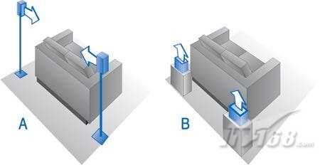 ??? 不將揚(yáng)聲器裝在墻上的替代方法如圖9所示。使用支架將環(huán)繞揚(yáng)聲器安置在兩側(cè)高于人耳的位置(A)能獲得和安裝在側(cè)墻上一樣的效果。您也可以嘗試將它們安放在兩側(cè)或者后面并面朝上,或者就放置在地上,最好能離地幾十公分(B)。