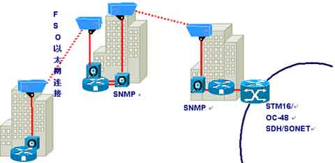 在校園網(wǎng)、小區(qū)網(wǎng)或大企業(yè)的內(nèi)部網(wǎng)建設(shè)中,經(jīng)常會(huì)碰到這樣一種情況:馬路對(duì)面的新建大樓急需接通,可挖路許可權(quán)卻遲遲不能得到批準(zhǔn)或者根本就無法取到。這時(shí)候無線光通信技術(shù)便可以大顯身手。如圖1所示。其中,SNMP(簡單網(wǎng)絡(luò)管理器為可選項(xiàng))。無線光通信設(shè)備配備標(biāo)準(zhǔn)RJ45接口或光接口,且對(duì)協(xié)議透明,可以非常方便的完成局域網(wǎng)的連接。