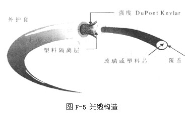 圖F-5說明光纜的結(jié)構(gòu)。其芯線是光從中傳輸?shù)耐该鞴?或塑料)。覆層是包圍芯線的玻璃外殼。覆層的作用就像一面鏡子,將光反射回芯線中。覆層本身覆蓋有一個塑料層,必要時還覆蓋有強度材料。
