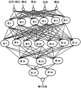 根據(jù)神經(jīng)網(wǎng)絡(luò)結(jié)構(gòu)要求,上下各個節(jié)點(diǎn)之間相互有聯(lián)系。但從物理意義上來看,河網(wǎng)上下區(qū)域并不是都有必然聯(lián)系。因此,本文將上下區(qū)域沒有必然聯(lián)系的點(diǎn)之間的權(quán)重強(qiáng)加為0,這樣使模型既滿足神經(jīng)網(wǎng)絡(luò)結(jié)構(gòu)的要求,又符合河網(wǎng)水流運(yùn)動規(guī)律。如區(qū)3除與區(qū)11有水量交換外,與第三層其余節(jié)點(diǎn)之間沒有水量交換,故在模型中可以賦0.另外為簡化起見,三口來流合并為一個來流,故荊江與洞庭湖之間的關(guān)系可以概化為與圖2相似的網(wǎng)絡(luò)模型。