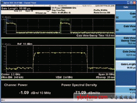 圖4 圖中的信道功率測(cè)量使用WiMAX下行鏈路猝發(fā)脈沖進(jìn)行選通。該猝發(fā)脈沖由1個(gè)前導(dǎo)碼和8個(gè)符碼組成