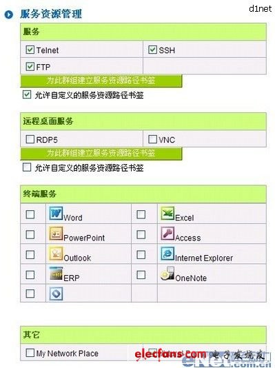 IPSec VPN在部署時(shí)無(wú)法保證對(duì)最終用戶的訪問限制,即只允許合作伙伴訪問內(nèi)部網(wǎng)絡(luò)中的指定資源,而且部署IPSec VPN會(huì)要求更改合作伙伴防火墻的安全策略,這是很難實(shí)現(xiàn)的。采用SSL VPN則完全不存在上述問題,企業(yè)可以依情況進(jìn)行限制設(shè)定開放不同的訪問權(quán)限,這樣限制后,某一個(gè)合作伙伴只能訪問一個(gè)站點(diǎn)中的某些頁(yè)面和文件夾,而且不需要修改合作伙伴的安全策略,只要合作伙伴能夠訪問Internet即可。用俠諾SSL001來說,下圖就是服務(wù)資源管理界面,只需勾選不同的服務(wù),用戶在遠(yuǎn)程訪問就會(huì)看到不同的界面,只能看到開放給他的那部分資源。