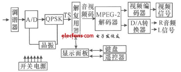 ?。?1)組成: 數(shù)字衛(wèi)星接收機的基本組成見圖1, 主要由調諧器、QPSK解調器、MPEG - 2 解碼器、視頻編碼器、音頻D /A 轉換器、控制顯示面板(鍵盤)、開關電源等部分組成。