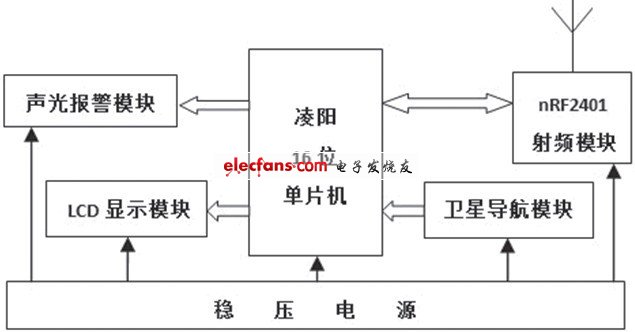 本系統(tǒng)設(shè)計(jì)包括單片機(jī)控制模塊、射頻通信模塊、衛(wèi)星導(dǎo)航模塊、液晶顯示模塊、聲光報(bào)警模塊和穩(wěn)壓電源模塊。系統(tǒng)采用LM1575芯片將車載12V電源轉(zhuǎn)換為5V電源,以凌陽SPCE061A型16位單片機(jī)為控制中心,使用nRF2401無線射頻收發(fā)模塊實(shí)現(xiàn)數(shù)據(jù)的發(fā)送和接收,使用OTrack-32北斗/GPS/GLONASS多模兼容導(dǎo)航芯片模塊實(shí)現(xiàn)經(jīng)緯度坐標(biāo)的獲取,同時(shí)使用12864型LCD顯示模塊實(shí)時(shí)顯示車距檢測信息,并使用蜂鳴器和LED實(shí)現(xiàn)聲光報(bào)警。系統(tǒng)框圖如圖1所示。