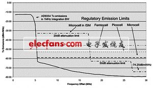 圖3包含來(lái)自圖2的ADI公司AD9354性能曲線,以便快速比較法定限制與收發(fā)器輻射。由于AD9354信道外能量遠(yuǎn)低于-33dBm/MHz限制線,因此該收發(fā)器滿足20dB衰減要求。