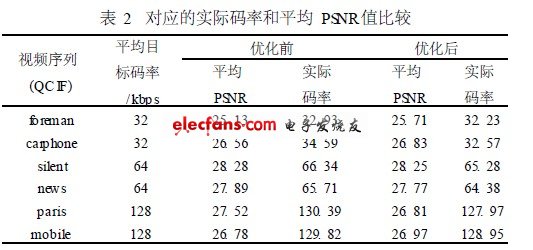 表2給出了標(biāo)準(zhǔn)中原碼率控制算法和本文提出的算法對(duì)于六種標(biāo)準(zhǔn)序列在不同目標(biāo)碼率和幀率下的實(shí)際編碼碼率和平均重建圖像的峰值信噪比PSNR值的測(cè)試結(jié)果;表3給出了原標(biāo)準(zhǔn)算法和本文算法對(duì)應(yīng)的比特率偏移與平均PSNR值差值比較。