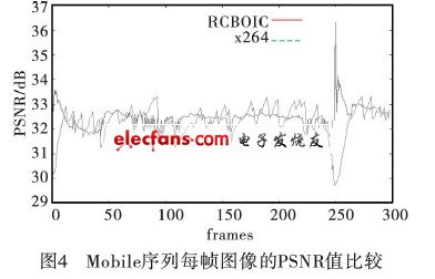 為了進(jìn)一步對(duì)比改進(jìn)算法的效果,本文將視頻序列每幀的PSNR值通過坐標(biāo)圖的形式給出,圖中橫坐標(biāo)為幀的編號(hào),縱坐標(biāo)為對(duì)應(yīng)的PSNR值。本文中給出了具有mobile(碼率限制較高比特128kbps)的視頻序列PSNR圖,如圖4所示,即限定碼率分別為32kbps、64kbps和128kbps的典型視頻。從圖4中可以看出,改進(jìn)算法的PSNR值波動(dòng)相對(duì)較小,從而在視覺上不會(huì)感覺到明顯的圖像質(zhì)量變化,這就保證了圖像質(zhì)量的平穩(wěn)過渡,具有較高的主觀視覺質(zhì)量。