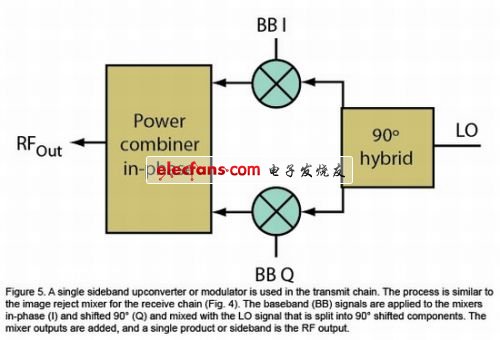 圖5:單邊帶上變頻器或調(diào)制器用于發(fā)射信號鏈中。此過程類似于接收信號鏈的鏡像抑制混頻器(圖4)?;鶐?BB)信號被施加到同相(I)和90°相移(Q)混頻器,并與分成90°相移分量的LO信號進(jìn)行混頻。增加了混頻器輸出,單個產(chǎn)物或邊帶為RF輸出。