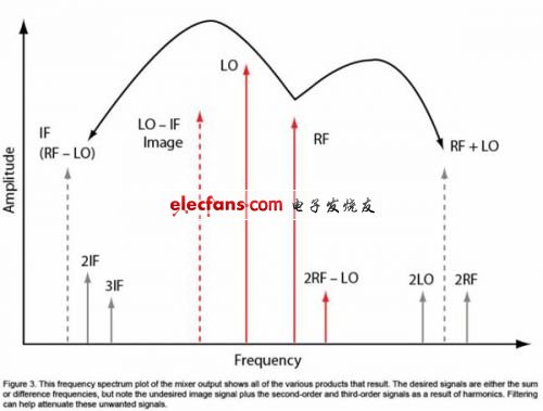 圖3:混頻器輸出的頻譜圖顯示產(chǎn)生的所有不同產(chǎn)物。需要的信號為和頻或差頻,不過請注意,有害鏡像信號和二階和三階信號為諧波的結(jié)果。濾波有助于減少這些有害信號。