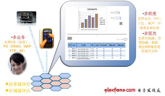 從業(yè)務(wù)上看, CS域的用戶感知,主要關(guān)注點(diǎn)為語音業(yè)務(wù)、vp業(yè)務(wù);PS域上的用戶感知,主要關(guān)注點(diǎn)為www業(yè)務(wù)、ftp業(yè)務(wù)、IM業(yè)務(wù)、wap業(yè)務(wù)。通過對(duì)這些業(yè)務(wù)進(jìn)行話單級(jí)的評(píng)分與失分分配,再匯聚成區(qū)域級(jí)的業(yè)務(wù)評(píng)分與失分要因分配,從而達(dá)到從微觀到宏觀,從用戶到網(wǎng)絡(luò)的整體優(yōu)化。