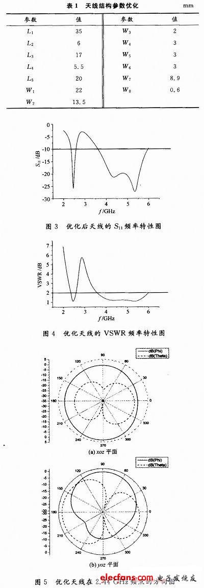 本文通過(guò)分析地板寬度W7、輻射貼片處的橫條寬度W3、輻射貼片與地板之間的縫隙W4、U形片的W2長(zhǎng)度以及L形片的L4長(zhǎng)度等幾個(gè)參數(shù)的變化對(duì)天線S11頻率特性的影響,經(jīng)過(guò)一系列的優(yōu)化對(duì)比,得出以下數(shù)據(jù),如表1所示。優(yōu)化后仿真所得的天線的仿真性能參數(shù)S11,VSWR以及遠(yuǎn)區(qū)場(chǎng)的方向圖如圖3~圖7所示。