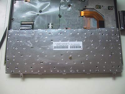 第一步還算順利,不過(guò)接下來(lái)遇到了麻煩。鍵盤拆下來(lái)后發(fā)現(xiàn)了想維修鍵盤薄膜遠(yuǎn)沒有想像的那么簡(jiǎn)單。因?yàn)檫@款筆記本是超薄設(shè)計(jì),為了降低鍵盤高度,同時(shí)加強(qiáng)熱導(dǎo)性,只采用了很少的幾個(gè)短螺絲,其他地方都是靠鉚釘焊接來(lái)連接的,想看到鍵盤薄膜根本沒門,更別提把鍵盤拆開取出薄膜維修了。