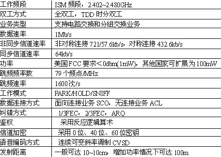 藍牙產(chǎn)品采用的是一種稱之為跳頻的技術(shù),能夠抗信號衰落;工作于2.4GHz的ISM (即工業(yè)、科學、醫(yī)學)頻段,以省去申請專用許可證的麻煩;采用FM調(diào)制方式,使設(shè)備變得更為簡單可靠; "藍牙"的每一個話音通道支持 64kb/s的同步話音,異步通道支持的最大速率為721Kbps、反向應(yīng)答速率為57.6Kbps的非對稱連接,或者432.6kb/s的對稱連接。