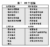 SJ/T 11234-2001《軟件過程能力評估模型》針對軟件企業(yè)對自身軟件過程能力進行內部改進的需要,與CMMI連續(xù)表示形式基本相同。該模型有22個過程,分為4大類,即:過程管理類、項目管理類、工程化類和支持類,具體見表1。