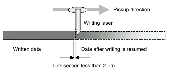 顧名思義Just Link一時停止再開始寫入時之銜接部分(link部分)的間隔(Data空白部分)非常的小為其一大特征實(shí)現(xiàn)在12x紀(jì)錄時link部分在2micro meter以下之超完美link處理若link部分在2micro meter之下的話,在error訂正處理前之error rate 之增加將會微乎其微,當(dāng)然error訂正(c1訂正 ,c2訂正)后的data將不會有任何影響。