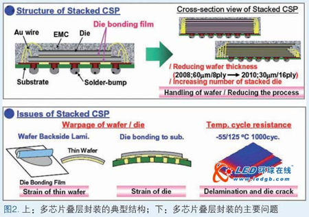 存儲(chǔ)器件廣泛關(guān)注多芯片疊層封裝能否實(shí)現(xiàn)性能更高、體積更小且更薄。圖2(上)示出了多芯片疊層封裝的典型結(jié)構(gòu)和發(fā)展趨勢(shì)。此時(shí),芯片鍵合膜(DAF)的性質(zhì)對(duì)提高封裝性能極為重要。晶圓厚度與日俱減,堆疊芯片的數(shù)目則不斷增加。由此產(chǎn)生了下列問(wèn)題(圖2下):DAF層壓DAF后薄晶圓的翹曲;將芯片粘到襯底后封裝的翹曲;熱循環(huán)測(cè)試過(guò)程中的分層和芯片破裂。