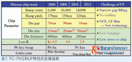 如表1所示,倒裝芯片封裝的發(fā)展趨勢(shì)是密度更高、芯片與襯底間間隙更窄、芯片尺寸更大、速度更快(更低k值)。低應(yīng)力和窄間隙填充將來(lái)對(duì)底充膠材料越來(lái)越重要。另外,對(duì)超窄間隙封裝和硅通孔(TSV)封裝來(lái)說(shuō),迫切需要像不流動(dòng)的底充膠材料和底充膠膜等預(yù)涂材料。正在開(kāi)發(fā)滿(mǎn)足這一需求的新穎高強(qiáng)度樹(shù)脂系材料,這些材料對(duì)減少低k大芯片的破裂很有用。最新開(kāi)發(fā)的底充膠膜特別適用于減少一些綜合工藝步驟。