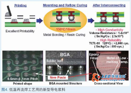 開(kāi)發(fā)了適用于低溫再流焊工藝的新型導(dǎo)電漿料。這種新穎漿料是由低熔點(diǎn)金屬和高抗熱性熱固樹(shù)脂系組成。它形成金屬鍵合和樹(shù)脂帶,能增強(qiáng)150℃再流焊工藝后的互連(圖4)。金屬鍵合減少了連接電阻,樹(shù)脂帶提高了TCT中連接的可靠性。采用此漿料可以方便地降低再流焊溫度,以減少超薄封裝的翹曲。