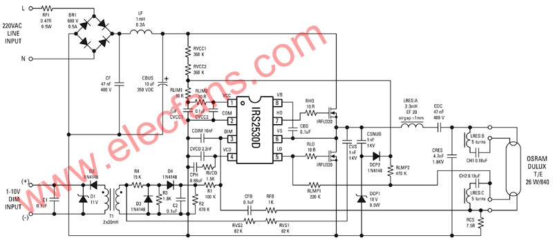 簡化了的電子鎮(zhèn)流器電路圖