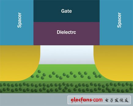 圖2:透過採用未摻雜電晶體通道(位于中間的白色區(qū)域,在淺綠色的輕摻雜閾值區(qū)以及深綠色的重?fù)诫s篩選區(qū)上方),SuVolta公司的平面CMOS製程可望使半導(dǎo)體電壓進(jìn)一步降低。