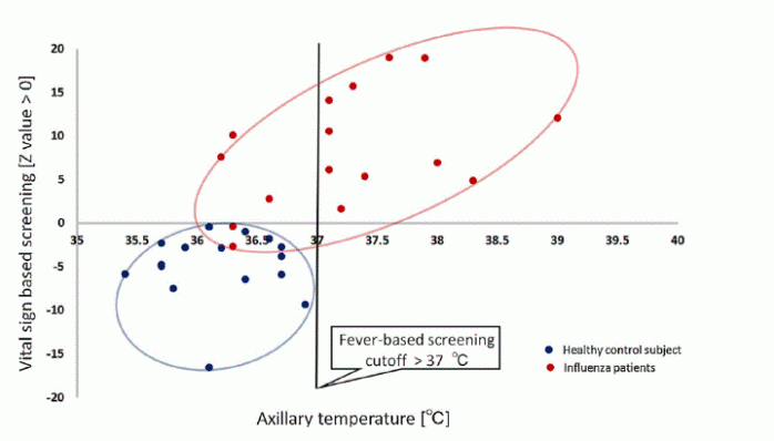 由下圖可見,傳統(tǒng)的單純體溫檢測法(大于37°截止閾值),二象限內(nèi)的樣本都會被遺漏掉,會存在大量的漏檢。