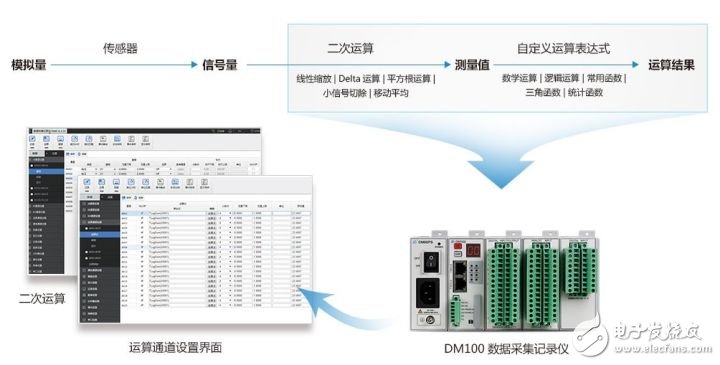 DM100數(shù)據(jù)采集模塊在采集信號量后,用戶可通過線性縮放、Delta運算、平方根運算等二次運算得到所需的測量值,同時還能對測量值進行自定義表達式運算,將測量值或運算值作為變量在表達式中執(zhí)行,保存運算結(jié)果。并可將測量數(shù)據(jù)及時保存在內(nèi)存中,支持8G以上存儲容量,連續(xù)記錄測量數(shù)據(jù)可達60天以上,并可根據(jù)指定通道生成報表,導出文本或二進制格式,方便數(shù)據(jù)的統(tǒng)計與分析。