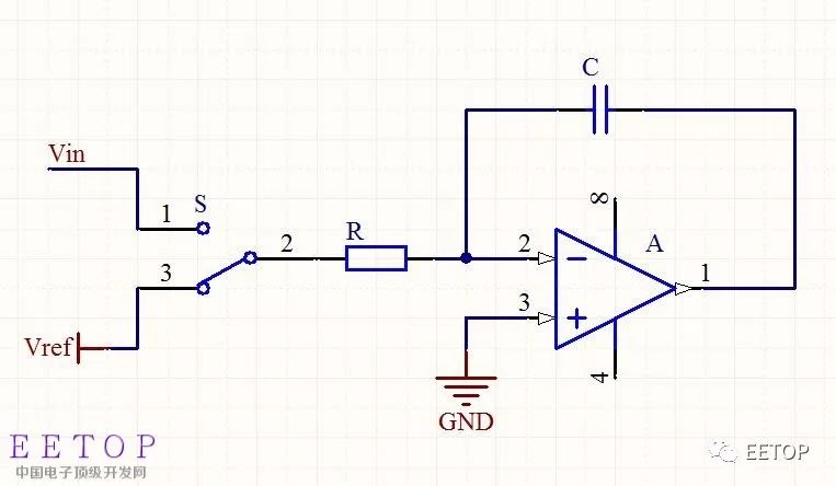 顧名思義,積分ADC的基本原理就是利用運(yùn)放對(duì)輸入信號(hào)和參考信號(hào)進(jìn)行積分輸出,這里參考信號(hào)一般與輸入信號(hào)極性相反,這樣輸出電壓就會(huì)有上升時(shí)間和下降時(shí)間,根據(jù)計(jì)數(shù)器來統(tǒng)計(jì)時(shí)間,最后按照函數(shù)關(guān)系得到采樣信號(hào)的值。